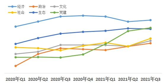 從近幾個(gè)季度的評(píng)估結(jié)果來看,經(jīng)濟(jì)領(lǐng)域熱度值領(lǐng)先其他領(lǐng)域;黨建領(lǐng)域熱度值從2020年第三季度開始穩(wěn)步上升,且增幅高于文化、社會(huì)等領(lǐng)域;政治領(lǐng)域改革熱度值從今年一季度以來持續(xù)呈上升趨勢。