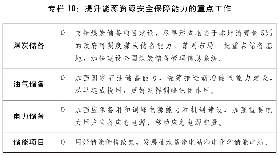 二是提升能源資源安全保障能力。深入推進煤電油氣產供儲銷體系建設。推進石油儲備重大工程建設,加快華北、西北等地下儲氣庫新建和擴容達容建設。有序核增一批煤炭先進產能,加快提升煤炭儲備能力。加強抽水蓄能等調峰電源建設,繼續(xù)發(fā)揮傳統(tǒng)能源特別是煤炭、煤電的兜底保供和調峰作用,積極推進現(xiàn)有煤電項目改造升級。推進白鶴灘、羊曲等重大水電工程建設。加大力度規(guī)劃建設以大型風光電基地為基礎、以其周邊清潔高效先進節(jié)能的煤電為支撐、以穩(wěn)定安全可靠的特高壓輸變電線路為載體的新能源供給消納體系。加快推進國家儲備建設,健全統(tǒng)一的戰(zhàn)略和應急物資儲備體系。