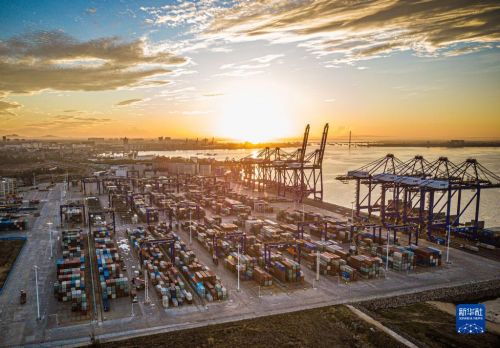在海南洋浦經(jīng)濟(jì)開發(fā)區(qū)拍攝的洋浦國際集裝箱碼頭(2021年5月26日攝,無人機(jī)照片)。新華社記者 蒲曉旭 攝