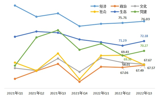 1、生態(tài)、黨建領域上升。從六大領域來看,經(jīng)濟領域76.03,政治領域67.49 ,文化領域67.67,社會領域67.57,生態(tài)領域72.18,黨建領域70.27。與上一季度相比,經(jīng)濟、政治、生態(tài)、黨建領域均有上升,文化、社會領域略有下降。