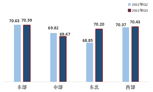2、從區(qū)域來看,東北、西部地區(qū)均超越中部地區(qū)。東部、西部、東北、中部指數(shù)分別為70.59、70.43、70.20、69.47。區(qū)域熱度指數(shù)呈適當?shù)牡赜蛱卣鳎瑬|部地區(qū)第一,西部地區(qū)第二,東北地區(qū)超越中部地區(qū)名列第三,中部地區(qū)最后。東北地區(qū)指數(shù)增幅較大,西部地區(qū)有所增長,東部、中部地區(qū)小幅下滑。