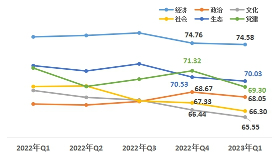 1、經(jīng)濟(jì)、生態(tài)領(lǐng)域小幅下降。從六大領(lǐng)域來(lái)看,經(jīng)濟(jì)領(lǐng)域74.58,政治領(lǐng)域68.05,文化領(lǐng)域65.55,社會(huì)領(lǐng)域66.30,生態(tài)領(lǐng)域70.03,黨建領(lǐng)域69.30。與上一季度相比,六大領(lǐng)域均有小幅下降;與去年一季度相比,政治領(lǐng)域同比上升,其他領(lǐng)域同比小幅下降。