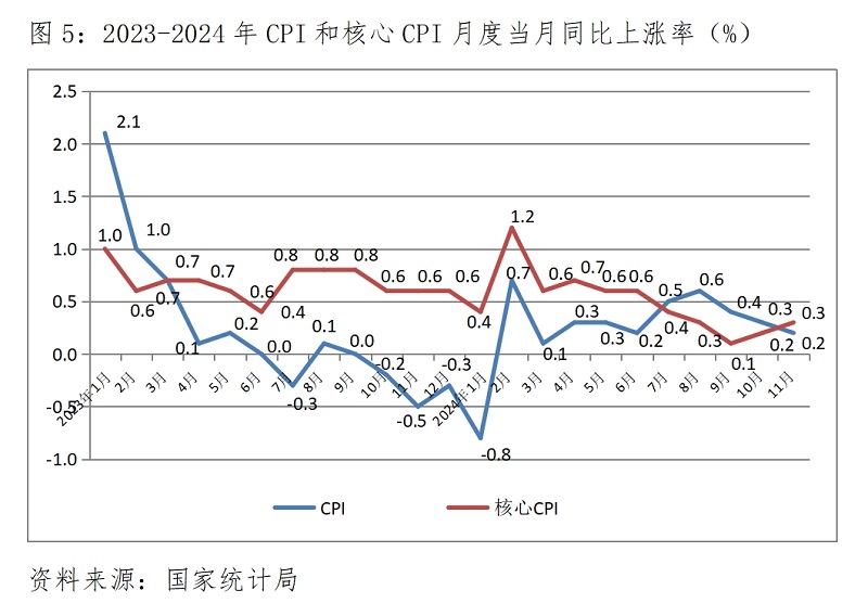 (三) CPI漲幅繼續(xù)小幅回落。11月份,CPI同比上漲0.2%,比10月份上漲0.3%回落了0.1個百分點,而10月份漲幅比9月份漲幅回落0.1個百分點,延續(xù)了上月漲幅回落的態(tài)勢。其中食品價格上漲1.0%,比上月上漲2.9%回落1.9個百分點;非食品價格持平,上月為下降0.3%。11月份,核心CPI同比上漲0.3%,比10月份上漲0.2%回升了0.1個百分點。CPI和核心CPI漲幅都仍還比較低,說明市場需求仍還較為疲弱。