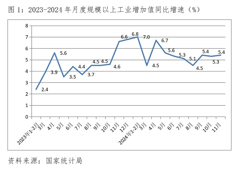 (一)工業(yè)增速由落轉升。11月份,規(guī)模以上工業(yè)增加值同比增長5.4%,比10月份增長5.3%回升了0.1個百分點,10月份增速比9月份增速5.4%回落了0.1個百分點。其中,制造業(yè)同比增長6.0%,比上月回升0.6個百分點;國有控股企業(yè)增長3.9%,回升0.1個百分點;私營企業(yè)增長4.5%,回落0.3個百分點。