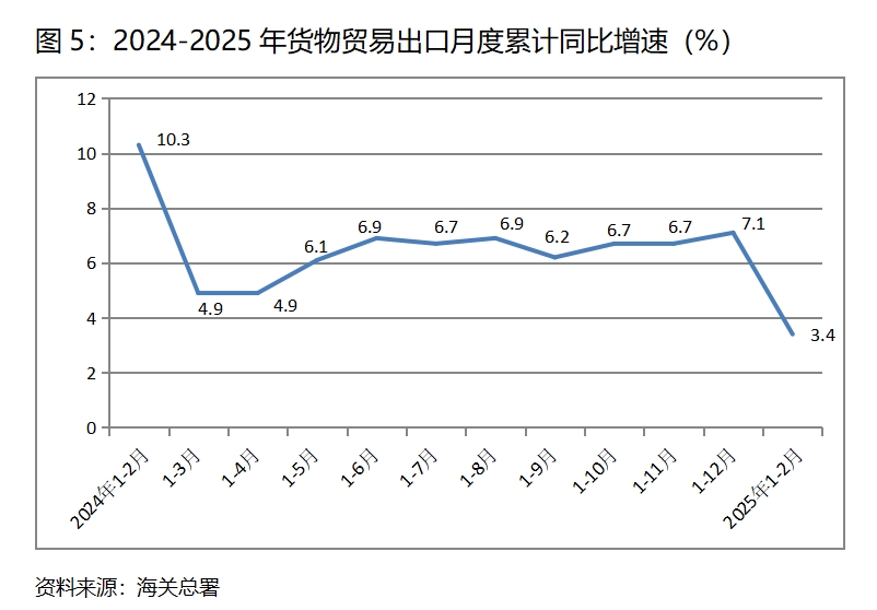 (二)貨物出口增速由升轉(zhuǎn)落。1-2月份,貨物出口同比增長3.4%,比上年1-12月份增長7.1%回落3.7個百分點,1-12月份比1-11月份回升0.4個百分點,呈現(xiàn)出增速由升轉(zhuǎn)落的態(tài)勢。貨物出口對主要貿(mào)易出口經(jīng)濟(jì)體增速全面回落,1-2月份對歐盟出口增長1.8%,比上年1-12月月份回落2.5個百分點;對美國出口增長3.4%,比1-12月份回落2.7個百分點;對東盟出口增長6.8%,比1-12月份回落6.6個百分點;對拉丁美洲出口增長4.4%,比1-12月份回落10.0個百分點。