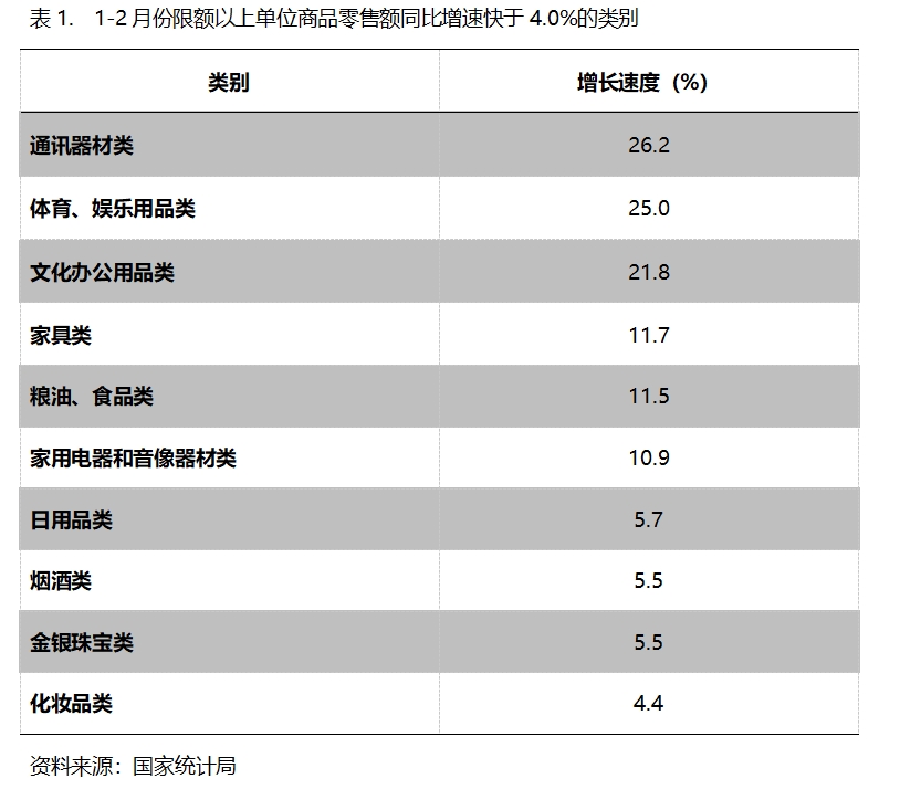 1-2月份,限額以上單位商品零售額增速快于社會消費品零售總額4.0%增速的共有10類,即通訊器材類增長26.2%,體育、娛樂用品類增長25.0%,文化辦公用品類增長21.8%,家具類增長11.7%,糧油、食品類增長11.5%,家用電器和音像器材類增長10.9%,日用品類增長5.7%,煙酒類增長5.5%,金銀珠寶類增長5.5%,化妝品類同比增長4.4%。