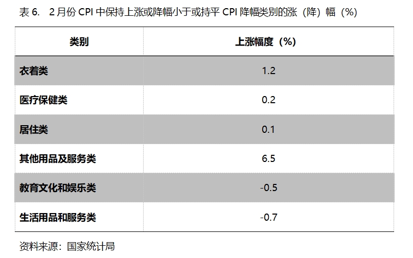 CPI中保持上漲的類別共4類,即衣著類價格同比上漲1.2%,醫(yī)療保健類上漲0.2%,居住類上漲0.1%,其他用品和服務(wù)類上漲6.5%;降幅小于或持平CPI降幅的類別共2類,即教育文化和娛樂類下降0.5%,生活用品及服務(wù)下降0.7%。
