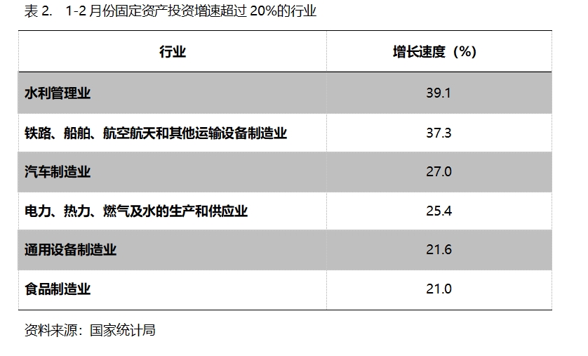 1-2月份,固定資產(chǎn)投資增速超過20%的主要行業(yè)共6個,即水利管理業(yè)增長39.1%,鐵路、船舶、航空航天和其他運輸設(shè)備制造業(yè)增長37.3%,汽車制造業(yè)增長27.0%,電力、熱力、燃?xì)饧八纳a(chǎn)和供應(yīng)業(yè)增長25.4%,通用設(shè)備制造業(yè)增長21.6%,食品制造業(yè)增長21.0%。