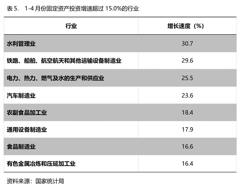 1-4月份,固定資產(chǎn)投資增速超過15%的主要行業(yè)共8個(gè),即水利管理業(yè)增長(zhǎng)30.7%,鐵路、船舶、航空航天和其他運(yùn)輸設(shè)備制造業(yè)增長(zhǎng)29.6%,電力、熱力、燃?xì)饧八纳a(chǎn)和供應(yīng)業(yè)增長(zhǎng)25.5%,汽車制造業(yè)增長(zhǎng)23.6%,農(nóng)副食品加工業(yè)增長(zhǎng)18.4%,通用設(shè)備制造業(yè)增長(zhǎng)17.9%,食品制造業(yè)增長(zhǎng)16.6%,有色金屬冶煉和壓延加工業(yè)增長(zhǎng)16.4%。
