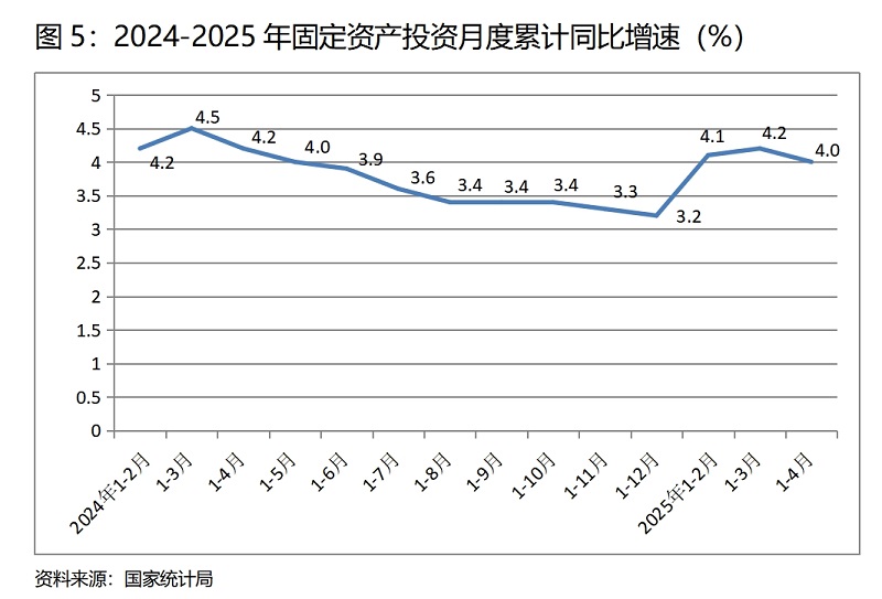 (五)投資增速由小升轉(zhuǎn)小落。1-4月份,固定資產(chǎn)投資同比增長(zhǎng)4.0%,比1-3月份增長(zhǎng)4.2%回落了0.2個(gè)百分點(diǎn),1-3月份增速比1-2月份回升了0.1個(gè)百分點(diǎn)。1-4月份國(guó)有控股投資同比增速比1-3月份回落0.3個(gè)百分點(diǎn);民間投資回落了0.2個(gè)百分點(diǎn)。三次產(chǎn)業(yè)投資中,第一產(chǎn)業(yè)投資增速回落2.8個(gè)百分點(diǎn),第二產(chǎn)業(yè)投資增速回落0.2個(gè)百分點(diǎn),第三產(chǎn)業(yè)投資增速由1-3月份增長(zhǎng)0.1%轉(zhuǎn)為下降0.2%。民間投資和第三產(chǎn)業(yè)投資增長(zhǎng)仍比較緩慢。