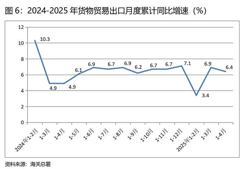 (六)貨物出口增速由升轉(zhuǎn)落。1-4月份,貨物出口同比增長(zhǎng)6.4%,比1-3月份增長(zhǎng)6.9%回落0.5個(gè)百分點(diǎn),1-3月份比1-2月份回升3.5個(gè)百分點(diǎn),增速呈現(xiàn)出由升轉(zhuǎn)落的態(tài)勢(shì)。貨物出口對(duì)主要貿(mào)易出口經(jīng)濟(jì)體增速有平有落也有升,1-4月份對(duì)歐盟出口同比增長(zhǎng)4.9%,與1-3月份4.9%的增速持平;對(duì)美國(guó)出口下降2.5%,1-3月份增長(zhǎng)5.6%,增速由增長(zhǎng)轉(zhuǎn)為下降;對(duì)東盟出口增長(zhǎng)11.5%,比1-3月份增長(zhǎng)9.2%回升2.3個(gè)百分點(diǎn);對(duì)拉丁美洲出口增長(zhǎng)11.5%,比1-3月份增長(zhǎng)10.7%回升0.8個(gè)百分點(diǎn)。在美國(guó)濫用關(guān)稅政策、對(duì)美國(guó)出口出現(xiàn)下降的情況下,我國(guó)出口仍能保持較快增長(zhǎng),特別是對(duì)一些主要經(jīng)濟(jì)體增長(zhǎng)呈現(xiàn)加快的勢(shì)頭,充分說明我國(guó)出口不僅有較強(qiáng)的競(jìng)爭(zhēng)力,也有較強(qiáng)的韌性。