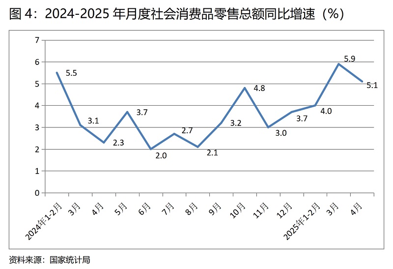 (四)零售增速由升轉(zhuǎn)落。4月份,社會(huì)消費(fèi)品零售總額同比增長(zhǎng)5.1%,比3月份增長(zhǎng)5.8%回落了0.7個(gè)百分點(diǎn),3月份比1-2月份增長(zhǎng)4.0%回升了1.9個(gè)百分點(diǎn)。4月份社會(huì)消費(fèi)品零售總額增速的回落,盡管有汽車及其油價(jià)下降的因素,但應(yīng)看到這是在上年同期基數(shù)較低基礎(chǔ)上的回落,說明消費(fèi)需求不足的問題仍還比較突出,在面對(duì)較大不確定性的國(guó)際局勢(shì),研究謀劃更加有效的擴(kuò)大消費(fèi)特別是服務(wù)消費(fèi)的政策措施顯得十分重要。
