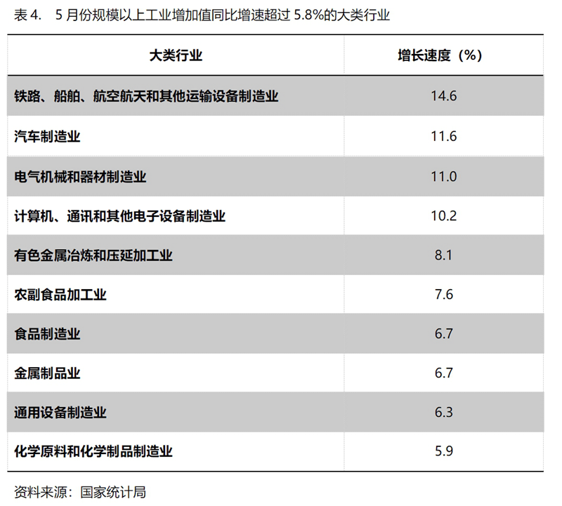 5月份,增長(zhǎng)速度超過(guò)規(guī)模以上工業(yè)增長(zhǎng)5.8%的主要大類行業(yè)共有10個(gè),即鐵路、船舶、航空航天和其他運(yùn)輸設(shè)備制造業(yè)增長(zhǎng)14.6%,汽車制造業(yè)增長(zhǎng)11.6%,電氣機(jī)械和器材制造業(yè)增長(zhǎng)11.0%,計(jì)算機(jī)、通訊和其他電子設(shè)備制造業(yè)增長(zhǎng)10.2%,有色金屬冶煉和壓延加工業(yè)增長(zhǎng)8.1%,農(nóng)副食品加工業(yè)增長(zhǎng)7.6%,食品制造業(yè)增長(zhǎng)6.7%,金屬制品業(yè)增長(zhǎng)6.7%,通用設(shè)備制造業(yè)增長(zhǎng)6.3%,化學(xué)原料和化學(xué)制品制造業(yè)增長(zhǎng)5.9%。