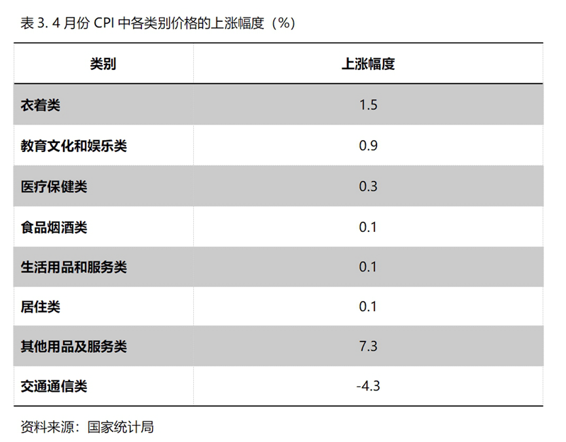 5月份,在CPI 8個(gè)類別中有7個(gè)類別保持上漲,1個(gè)類別下降。上漲的7個(gè)類別包括衣著類價(jià)格同比上漲1.5%,教育文化和娛樂(lè)類上漲0.9%,醫(yī)療保健類上漲0.3%,食品煙酒類上漲0.1%,生活用品及服務(wù)類上漲0.1%,居住類上漲0.1%,其他用品和服務(wù)類上漲7.3%;下降的雖然就交通通信類1個(gè)類別,但降幅較大,5月份同比下降4.3%。
