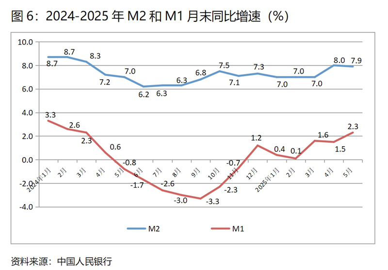 (六)M2增速由升轉(zhuǎn)落。5月末,廣義貨幣供應(yīng)量(M2)同比增長(zhǎng)7.9%,比4月末增長(zhǎng)8.0%回落0.1個(gè)百分點(diǎn),基本保持了上月末的增速;狹義貨幣供應(yīng)量(M1)增速比上月有所回升,5月末同比增長(zhǎng)2.3%,比4月末增長(zhǎng)1.5%回升0.8個(gè)百分點(diǎn),而4月末增幅比3月末增幅回落0.1個(gè)百分點(diǎn);流通中貨幣(M0)增速持續(xù)回升,5月末同比增長(zhǎng)12.1%,比4月末增長(zhǎng)12.0%回升0.1個(gè)百分點(diǎn),而4月末增速比3月末增速回升0.5個(gè)百分點(diǎn)。5月末M2增速與上月增速基本持平,M1和M0增速回升,表明貨幣政策仍在向適度寬松方向的要求運(yùn)行,但需要關(guān)注的還是M1增速仍還比較緩慢。