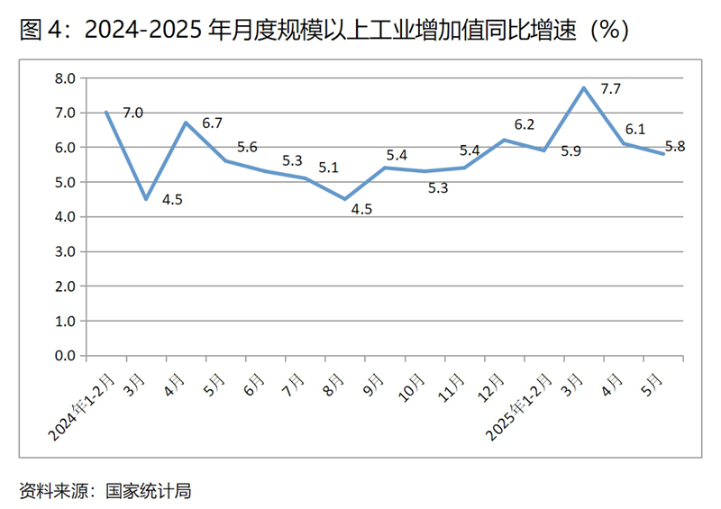 (四)工業(yè)增速持續(xù)回落。5月份,規(guī)模以上工業(yè)增加值同比增長(zhǎng)5.8%,比上月增長(zhǎng)6.1%回落了0.3個(gè)百分點(diǎn),4月份比3月份回落了1.6個(gè)百分點(diǎn),呈現(xiàn)出兩個(gè)月的連續(xù)回落。從工業(yè)三大門類看,主要是制造業(yè)增速回落。5月份采礦業(yè)同比增長(zhǎng)5.7%,與上月持平;制造業(yè)增長(zhǎng)6.2%,比上月回落0.4個(gè)百分點(diǎn);電力、熱力、燃?xì)饧八a(chǎn)和供應(yīng)業(yè)增長(zhǎng)2.2%,比上月回升0.1個(gè)百分點(diǎn)。5月份工業(yè)增速回落幅度雖然比上月收窄不少,但還是要密切關(guān)注回落背后反映出的工業(yè)增長(zhǎng)動(dòng)力未來(lái)可能變動(dòng)的趨勢(shì)。