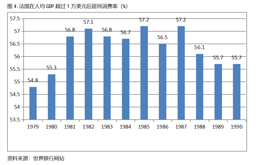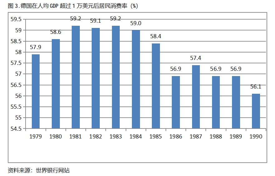 德國在人均GDP超過1萬美元后的12年期間,居民消費率一直保持在56.0%以上,同時還呈現(xiàn)出先提高后回落總體穩(wěn)定的趨勢。德國在1979年人均GDP超過1萬美元,當(dāng)年居民消費率為57.9%,1981年提高到59.2%,隨后又有所回落,1990年為56.1%,也就是說,德國在人均GDP超過1萬美元后的12年期間,居民消費率由當(dāng)年的57.9%提高到1981年最高的59.2%,共提高了1.3個百分點。