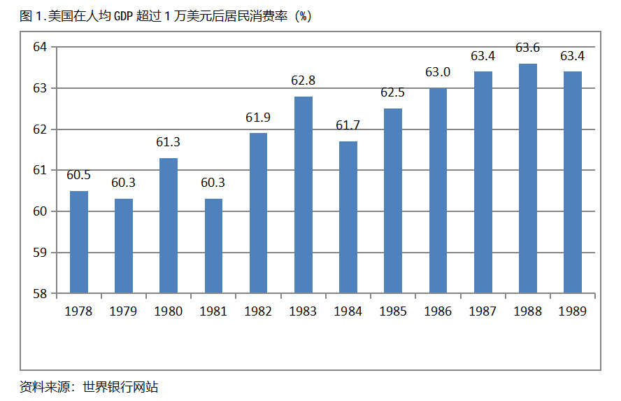 美國在人均GDP超過1萬美元后的12年期間注,居民消費率一直保持在60.0%以上,同時還呈現(xiàn)出總體持續(xù)提高的趨勢。美國在1978年人均GDP超過1萬美元,當(dāng)年居民消費率為60.5%,此后總體保持了持續(xù)提高的態(tài)勢,12年后的1989年提高到63.4%,提高了2.9個百分點。