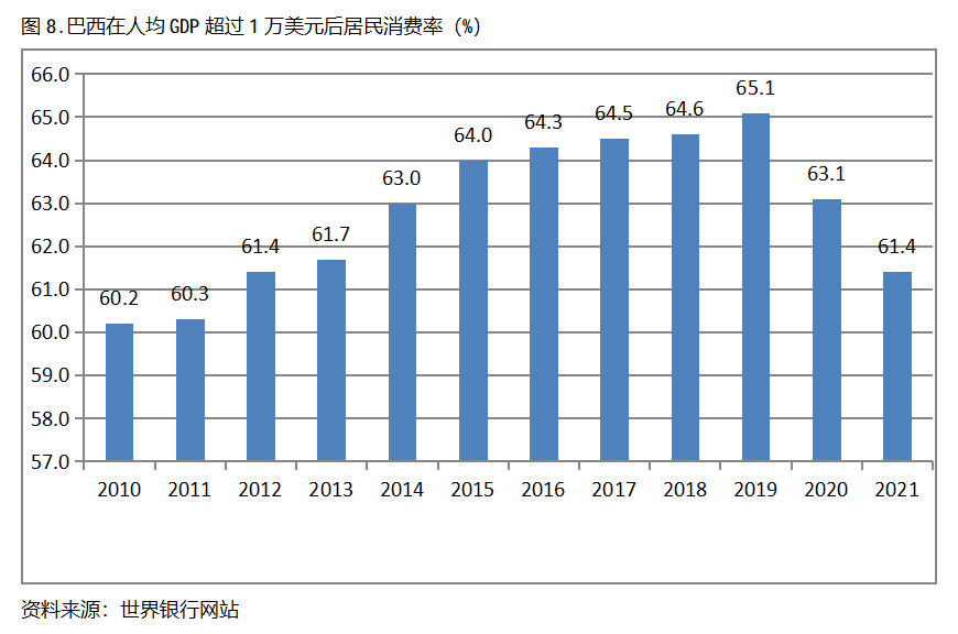 巴西在人均GDP超過1萬美元后的12年期間,居民消費率基本上保持在60.0%以上,也呈現(xiàn)出較長時間的提高,但后兩年也出現(xiàn)小幅的回落。巴西在2010年人均GDP超過1萬美元,當(dāng)年居民消費率為60.2%,2019提高到65.1%,隨后兩年出現(xiàn)回落,2021年為61.4%,也就是說,巴西在人均GDP超過1萬美元后的12年期間,居民消費率由當(dāng)年的60.2%提高到2019年最高的65.1%,共提高了4.9個百分點。