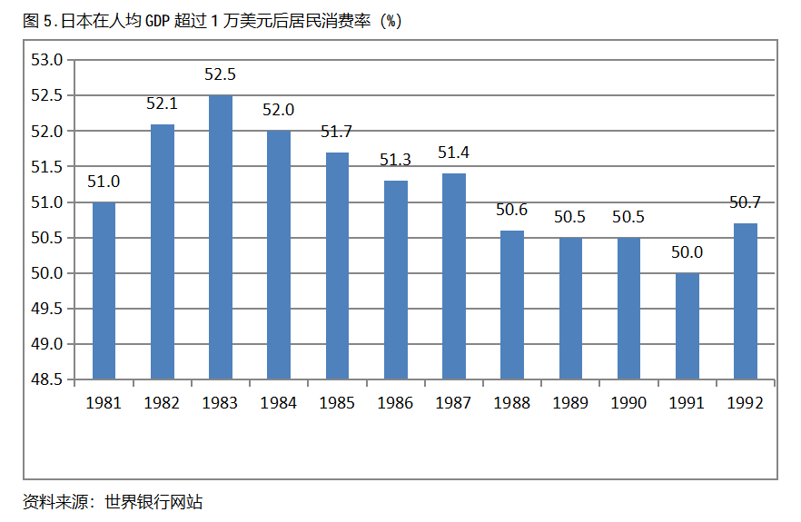 日本在人均GDP超過1萬美元后的12年期間,居民消費率一直保持在50.0%以上,同時也呈現(xiàn)出先提高后回落總體穩(wěn)定的趨勢。日本在1981年人均GDP超過1萬美元,當(dāng)年居民消費率為51.0%,1983提高到52.5%,隨后又有所回落,1992年為50.7%,也就是說,日本在人均GDP超過1萬美元后的12年期間,居民消費率由當(dāng)年的51.0%提高到1983年最高的52.5%,共提高了1.5個百分點。