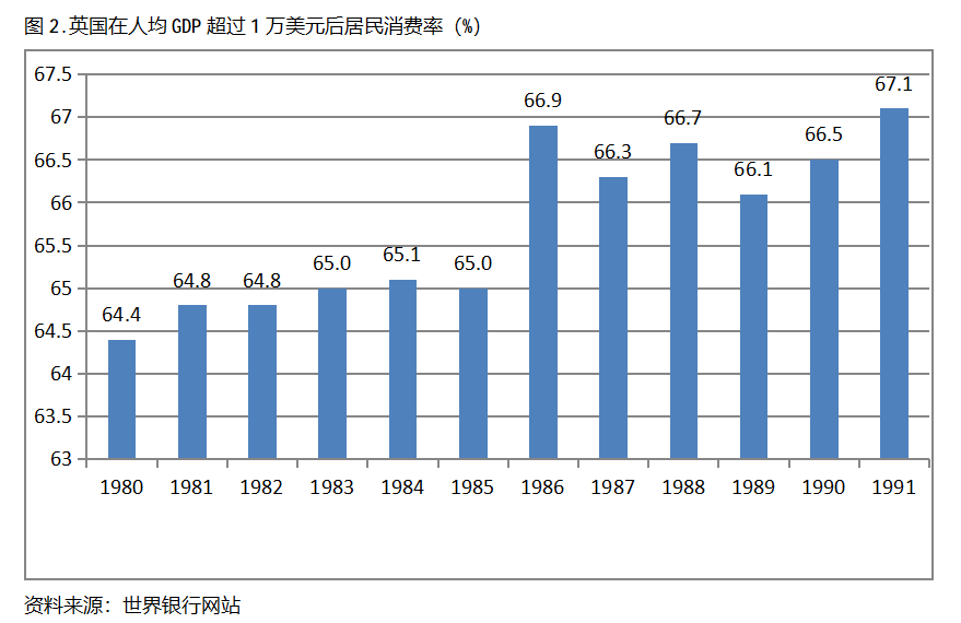 英國在人均GDP超過1萬美元后的12年期間,居民消費率一直保持在64.0%以上,同時也呈現(xiàn)出總體持續(xù)提高的趨勢。英國在1980年人均GDP超過1萬美元,當(dāng)年居民消費率為64.4%,此后總體保持了持續(xù)提高的態(tài)勢,12年后的1991年提高到67.1%,提高了2.7個百分點。