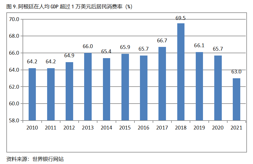 阿根廷在人均GDP超過1萬美元后的12年期間,居民消費率基本上保持在63.0%以上,也呈現(xiàn)出較長時間的提高,但后幾年也出現(xiàn)小幅的回落。阿根廷在2010年人均GDP超過1萬美元,當(dāng)年居民消費率為64.2%,2018提高到69.5%,隨后兩年出現(xiàn)回落,2021年為63.0%,也就是說,阿根廷在人均GDP超過1萬美元后的12年期間,居民消費率由當(dāng)年的64.2%提高到2018年最高的69.5%,共提高了5.3個百分點。
