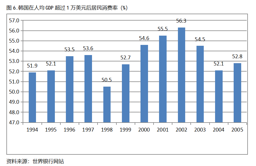 韓國在人均GDP超過1萬美元后的12年期間,居民消費率一直保持在50.0%以上,呈現(xiàn)出較長時間的提高,但后幾年出現(xiàn)小幅的回落。韓國在1994年人均GDP超過1萬美元,當(dāng)年居民消費率為51.9%,2002提高到56.3%,隨后出現(xiàn)回落,2005年為52.8%,也就是說,韓國在人均GDP超過1萬美元后的12年期間,居民消費率由當(dāng)年的51.9%提高到2002年最高的56.3%,共提高了4.4個百分點。