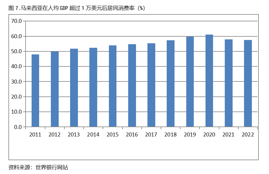 馬來西亞在人均GDP超過1萬美元后的12年期間,居民消費率基本上保持在50.0%以上,也呈現(xiàn)出較長時間的提高,但后幾年也出現(xiàn)小幅的回落。馬來西亞在2011年人均GDP超過1萬美元,當(dāng)年居民消費率為48.0%,2020提高到61.0%,隨后出現(xiàn)回落,2022年為57.6%,也就是說,馬來西亞在人均GDP超過1萬美元后的12年期間,居民消費率由當(dāng)年的48.0%提高到2020年最高的61.0%,共提高了13.0個百分點。